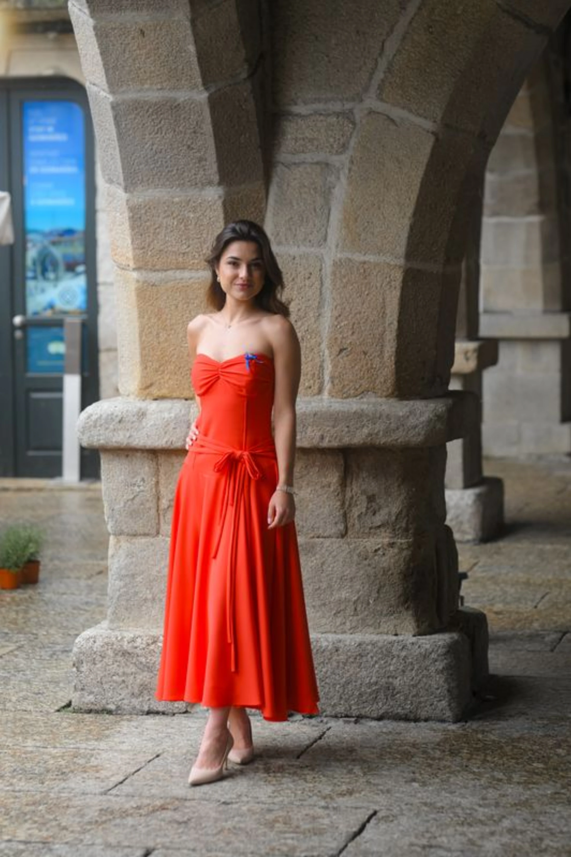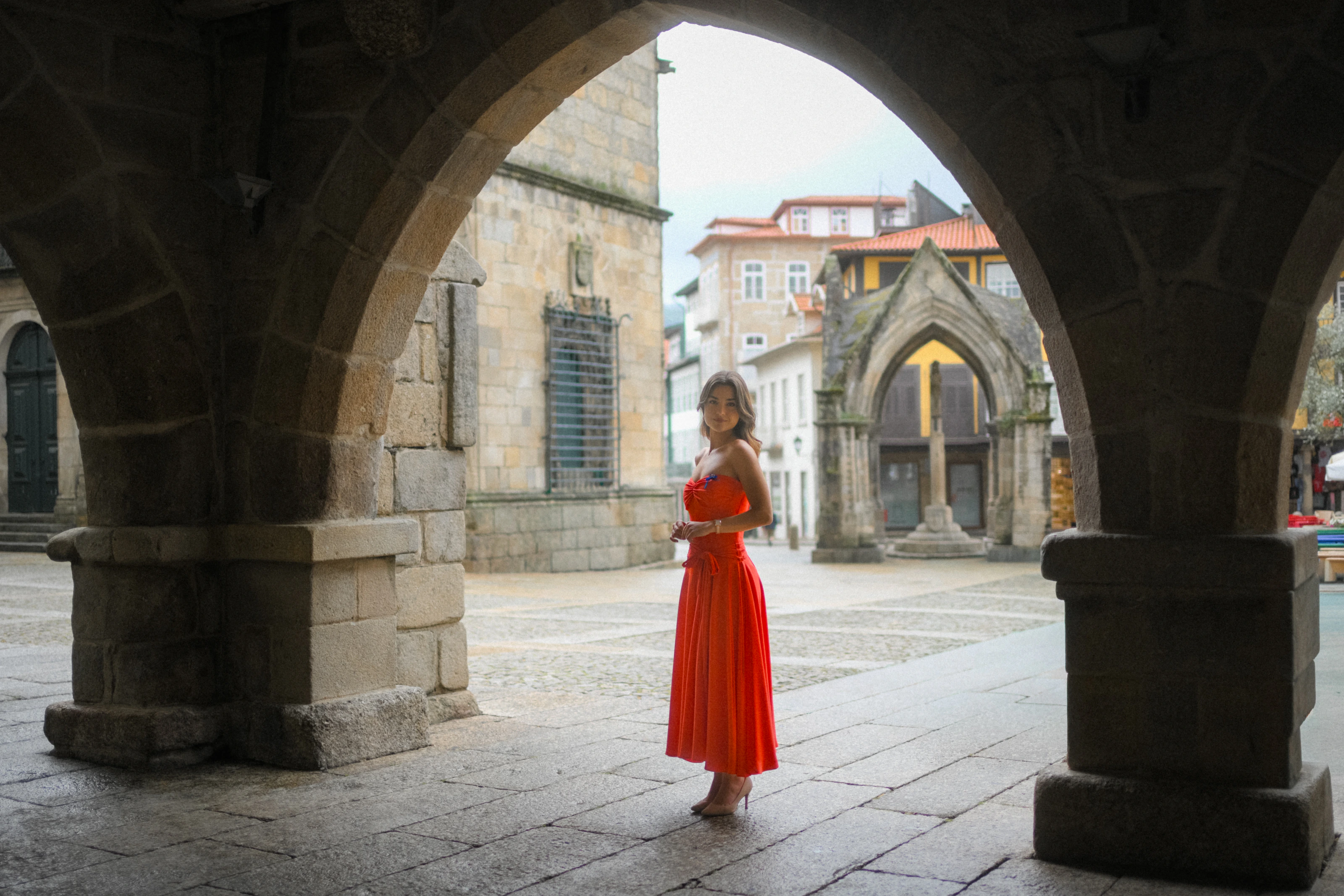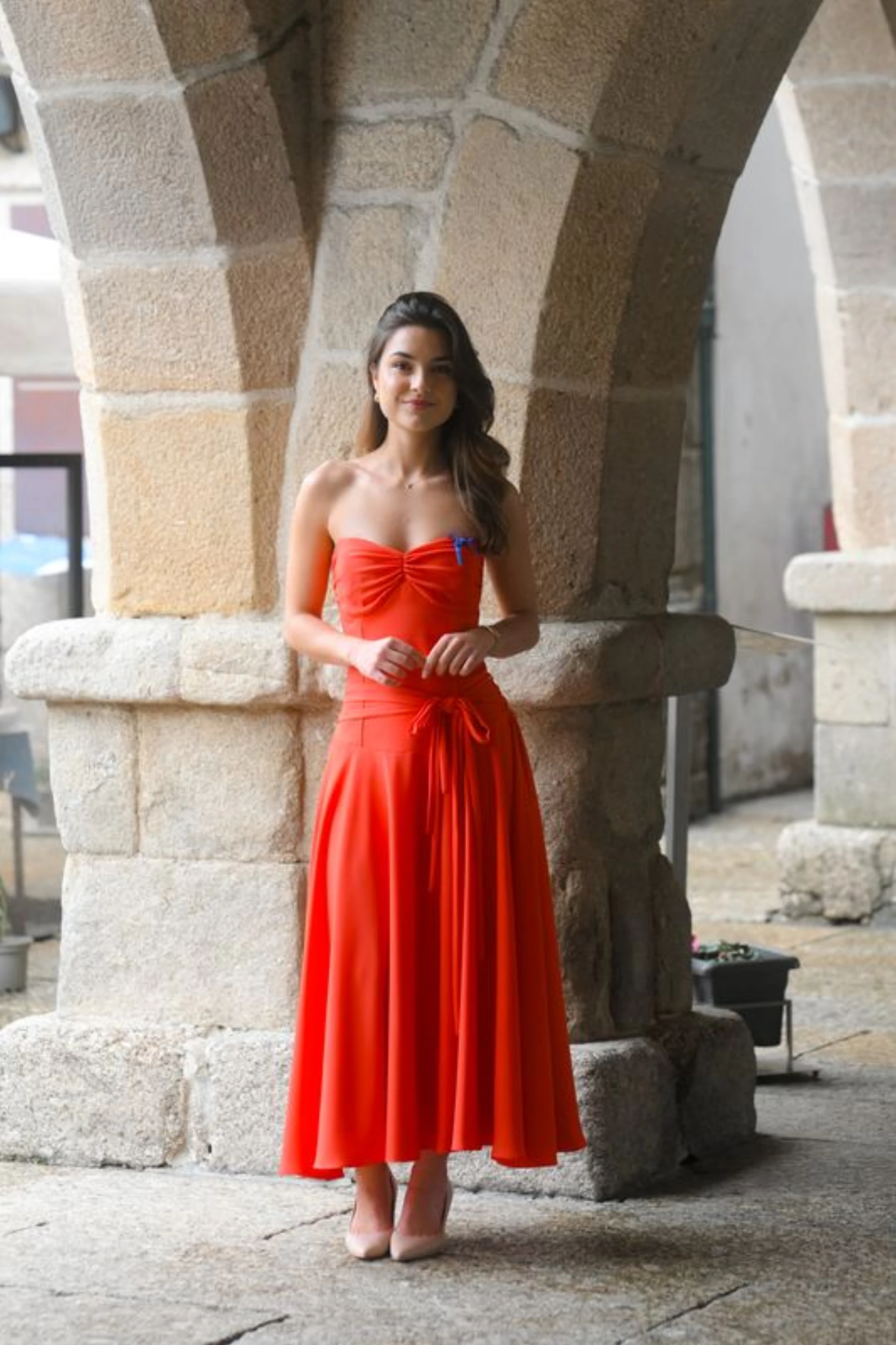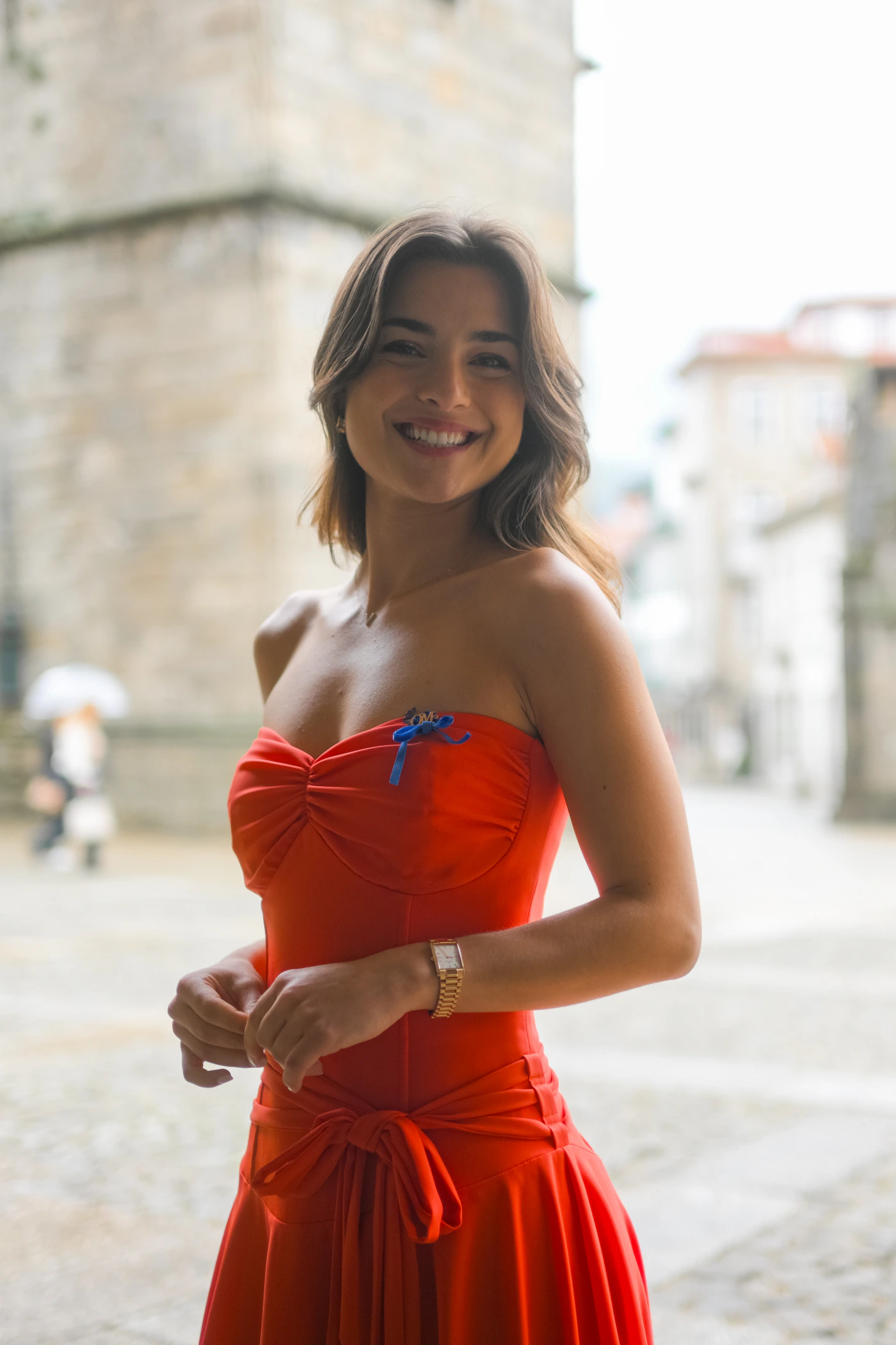 She is the woman who finds beauty in azulejo tiles and century-old bookshops. She walks between Livraria Lello and the miradouros of the Douro with the air of an In the Mood for Love heroine. Mandarin orange echoes the sunsets over the river; the corset, with its visible boning, is signature and confession under the hard midday light.